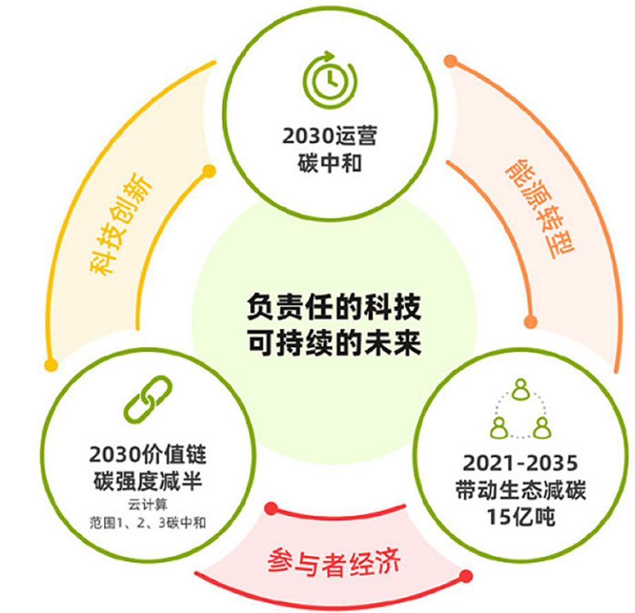 阿里巴巴提出了减碳的三大目标:一是2030年实现运营碳中和;二是2030年实现价值链碳强度减半;三是在2021-2035年期间带动生态减碳15亿吨。