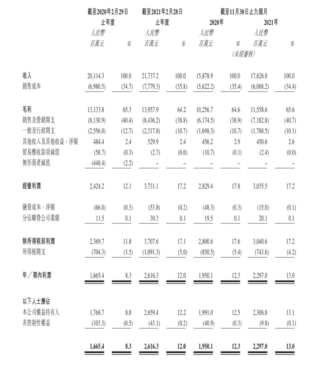 招股书显示,截至2021年11月30日止9个月,百丽时尚营收为176.26亿元,上年同期的营收158.79亿元增加11%;期内利润(除所得税后净利润)22.97亿元,较去年同期的19.5亿元增加18%。