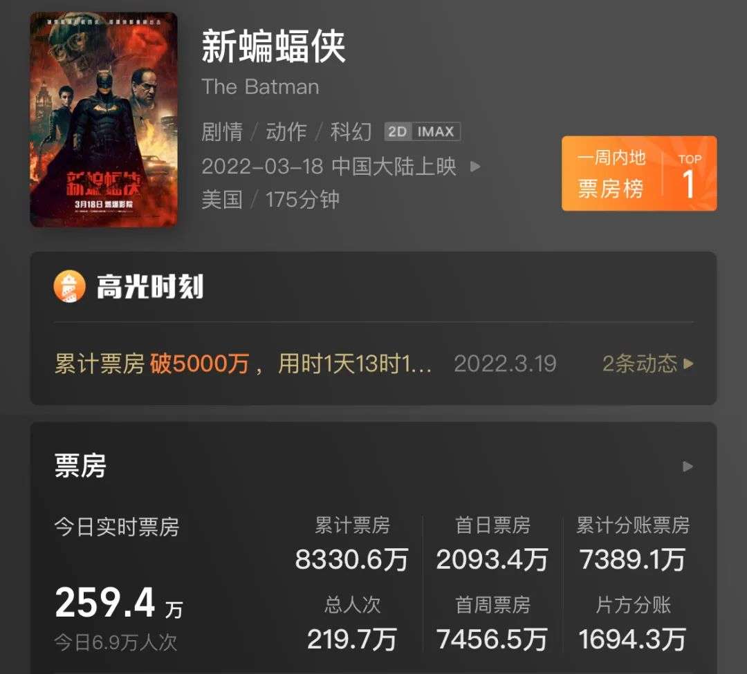 隔壁漫威已经三年没在中国内地上映新片,整个2021年也不见超英身影,到了2022年,《新蝙蝠侠》作为DC宇宙头号IP,来到严重缺乏新片的三月市场,业界并不苛求达到10亿元以上票房,但也有7-8亿的最初期待,上映前期,随着全国疫情严重,预测票房下降到4亿左右,而现在,《新蝙蝠侠》能否突破2亿大关,却无法给出肯定答案。