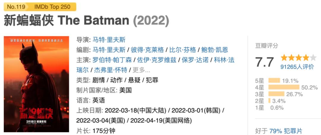 拒绝躺在舒适圈、回归真实凡人身份的“新蝙蝠侠”,由罗伯特·帕丁森这位常年浸泡在文艺电影的“忧郁王子”饰演,该电影也抛弃狂轰滥炸的视听噱头,进一步对社会现实和人性进行探索,最终,创作态度具备诚意的《新蝙蝠侠》在烂番茄网站上获得85%新鲜度,豆瓣也有7.7分,是近三年在内地上映评分最高的真人好莱坞电影。