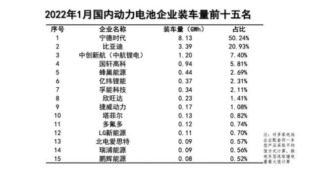 据公开资料显示,新能源车产业今年1月的电池装机量,宁德时代以8.13GWh,占比50.24%,稳坐第一把交椅。排名第二的比亚迪市占率则只有20.93%,相差一倍还多。