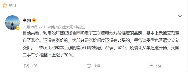 某新能源车企相关负责人表示,自去年下半年至今,宁德时代动力电池涨价两次,按一辆新能源车汽车的电池成本来算,每次上涨幅度在1万元。理想汽车CEO李想此前也在社交平台表示,二季度电池成本上涨的幅度「非常离谱」。