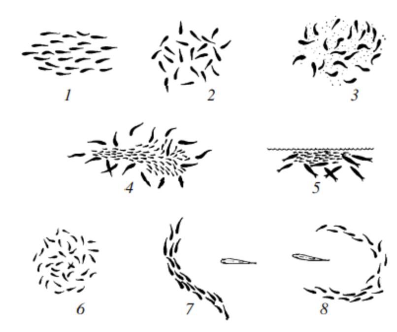 鱼群在不同状态时,有着不同的形态:(1)行进;(2)休息;(3)进食;(4、5)被很多捕食者围攻;(6)警戒周围;(7、8)躲避单个捕食者 | 参考文献[3]