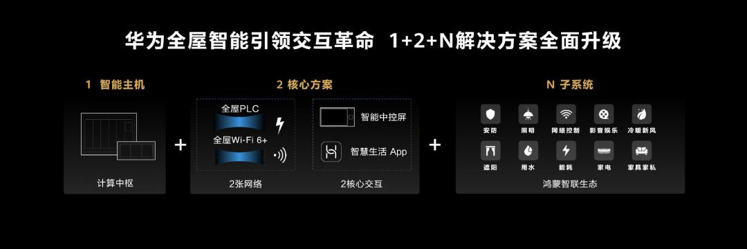 随后,在2021年4月8日,华为首次公布了1+2+N全屋智能解决方案,以全屋智能主机为中央控制系统,具备稳定可靠的PLC全屋网络以及高速全覆盖的全屋WiFi,支持丰富的可扩展鸿蒙生态,覆盖照明智控、安全防护、环境智控、水智控、影音娱乐、睡眠辅助、智能家电、遮阳智控等家居系统。