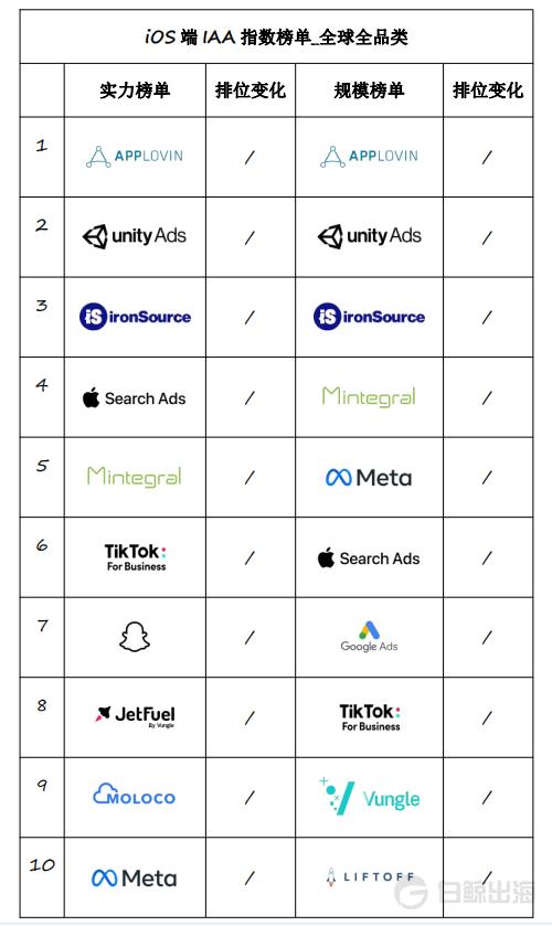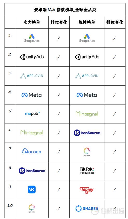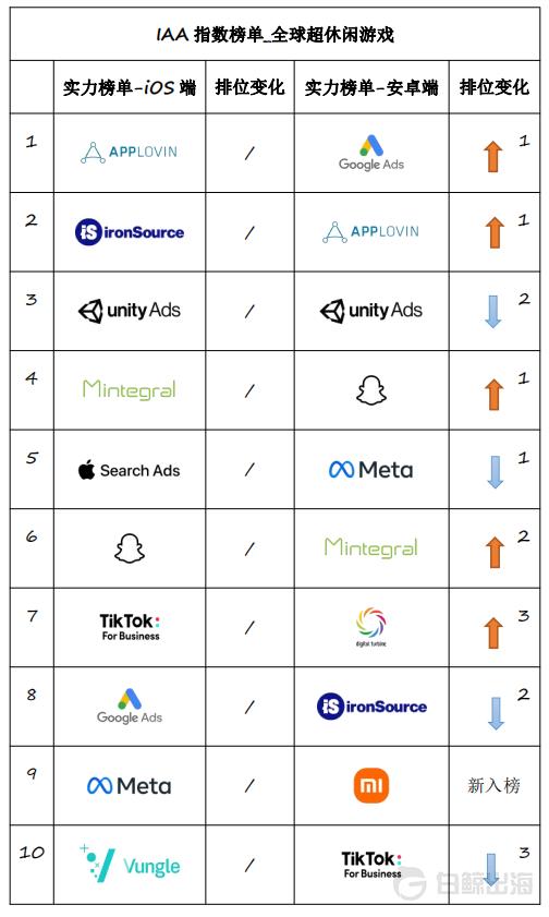 2、IAA 指数榜单,不论规模还是实力,前 4 位被 Google Ads、Unity Ads、AppLovin 和 Meta 牢牢占据。Mintegral 依然紧随其后。