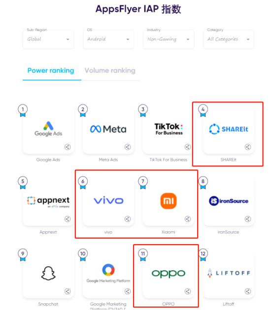 3、实力榜单的变化则非常大,在这里面,我们看到中国广告平台的排位上升特别明显,上升幅度最大的是茄子快传的 SHAREit,实力榜单上升 18 位,汇量科技 Mintegral 也上升16 位,TTFB 上升 10 位。而规模榜单上,三个广告平台也跻身 Top10,说明三个广告平台在需求量不变或者上升的基础上,在安卓端变现转化的能力都提升非常明显。