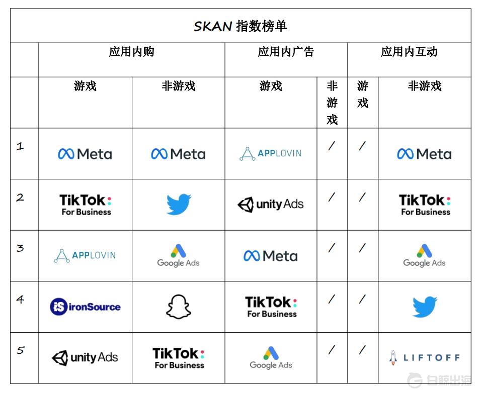 SKAN 指数其实是基于苹果官方归因解决方案 SKAdNetwork 的回传数据做出的一个帮助广告主衡量 iOS 端投放效果的榜单,属于确定性归因,但有一定局限性(仅限于授权 ATT 范围),这个榜单主要是帮助开发者了解各平台对新政的应对情况,可结合营销目的同时参考其他榜单来制定增长策略。例如看重内购收入转化的看 IAP、看重广告变现的看 IAA,看重留存率和召回旧用户/冲收入的看留存和再营销。而最后的增长榜单,开发者可以关注在迅速增长的广告平台,看有没有新的流量红利。上述也是 6 个榜单的主要作用。