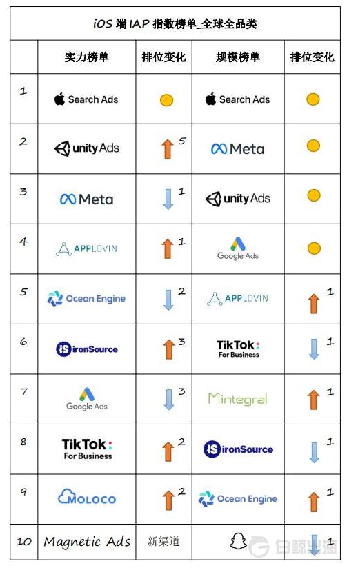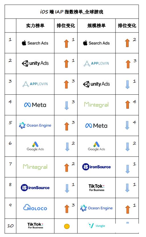 1、ASA 凭借生态优势在这一版报告里顺利登顶 iOS 端 IAP 全球游戏指数榜单。而从 iOS 端全球游戏的 IAP 指数榜单来看,Meta 不论是实力榜单、还是规模榜单,相较于全行业榜单,降幅都更大。相较之下,AppLovin 在 iOS 端游戏 IAP 变现方面,表现可圈可点,规模和实力都上升 3 位。