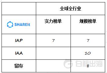 (2)、如果说出海的广告平台里面,还有亮眼成绩的,可能是茄子科技的 SHAREit,在 IAP 和 IAA 榜单都在刷“存在感”,位列安卓端 IAP 全球规模榜和实力榜第 7。此外还入围了安卓端全球留存规模榜第 8、实力榜第 11。在分类榜单上,如游戏和金融行业的也表现不错。
