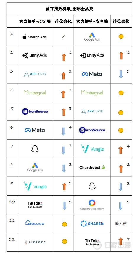 2、从排位变化来看,Unity Ads、AppLovin 和 ironSource 正在通过并购和双巨头进一步缩小差距。Snapchat 的留存表现双端均在下降,开发者应给予关注。