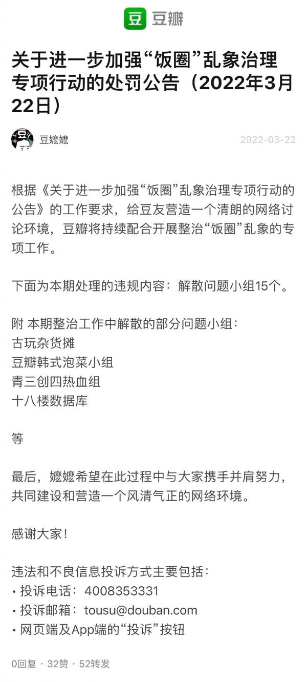 3月22日,豆瓣官方发布公告称:根据《关于进一步加强“饭圈”乱象治理专项行动的公告》的工作要求,给豆友营造一个清朗的网络讨论环境,豆瓣将持续配合开展整治“饭圈”乱象的专项工作。