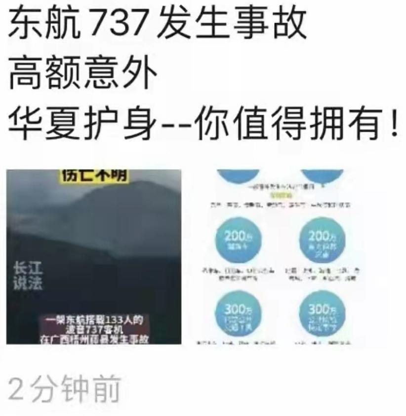 一则广为流传的朋友圈截图显示,有人正在推销一个名为“华夏护身”的险种,称“东航737发生事故 高额意外 华夏护身 你值得拥有”。刺猬公社(ID:ciweigongshe)查询发现,华夏保险公司旗下确实有一款全名为“华夏护身福”的保险,且保障额度高是其对外宣传推销的重点。