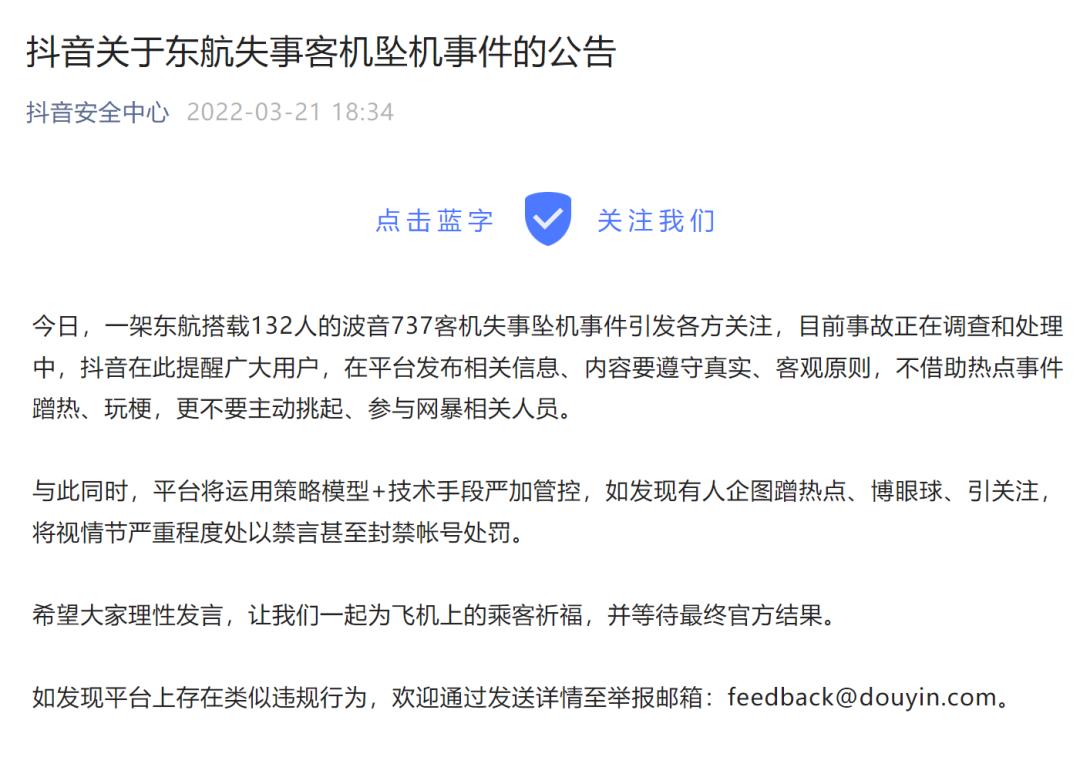 3月21日18:34,“抖音安全中心”在微信公众号上发出公告,提醒用户“在平台发布相关信息、内容要遵守真实、客观原则,不借助热点事件蹭热、玩梗,更不要主动挑起、参与网暴相关人员。”抖音还将运用策略模型+技术手段严加管控,如发现有人企图蹭热点、博眼球、引关注,将视情节严重程度处以禁言甚至封禁帐号处罚。3月22日,抖音称封禁了22个违规账号。