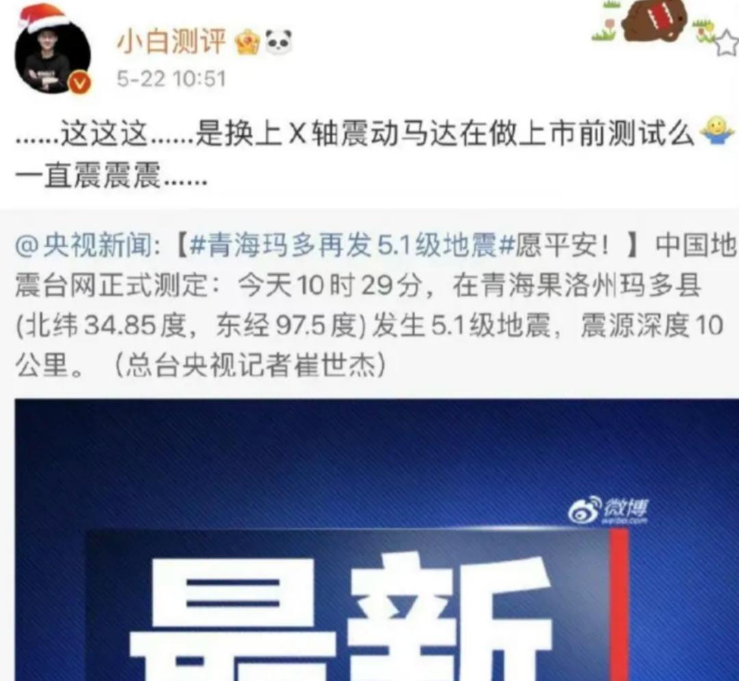 但显而易见,大多网友对这样的解释并不买账。其中有一个重要原因,在2021年5月22日青海发生5.1级地震的时间节点,小白测评官微转发央视新闻的报道并评论道:“……这这这……是换上X轴振动马达在做上市前测试么?一直震震震……”这条评论也曾被怒斥“翻车”“冷漠”“博眼球”。