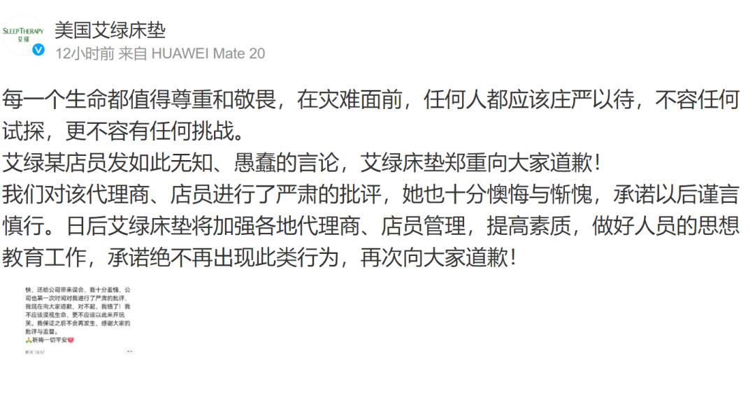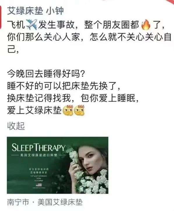 品牌艾绿床垫也在此次灾难中曝出令网友愤怒的一幕。艾绿的一位店员在朋友圈以空难为由发布营销广告:“飞机发生事故,整个朋友圈都火了,你们那么关心人家,怎么就不关心关心自己?”并在该段落后对艾绿的床垫产品进行宣传。