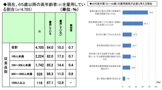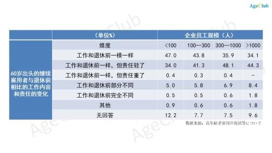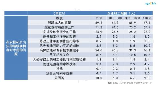 在安排60岁出头的继续雇佣者时,超过七成的公司都会继续安排员工本人熟悉的工作;超过六成会照顾员工本人的意愿;平均二成会安排身体负担少的工作;平均26.6%公司确保技术技能的传承,而且在规模越大公司这种倾向越明显。