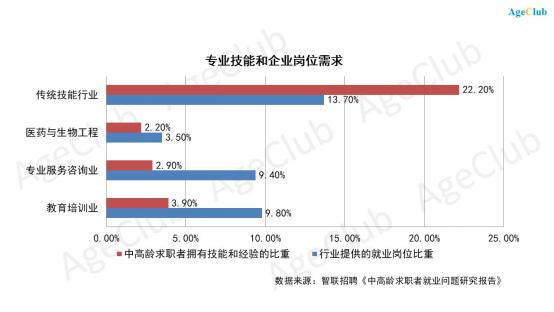 智联招聘2021年1月发布的数据显示,中高龄人群再就业时专业技能和企业岗位要求错配十分明显。