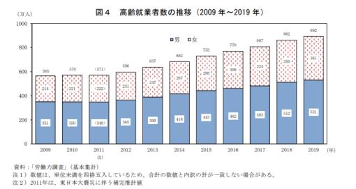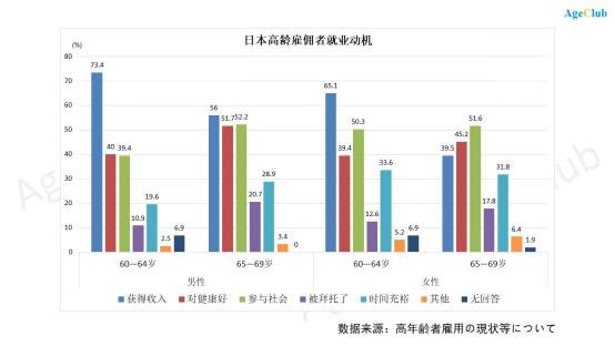 2019年,日本独立行政法人劳动政策研究发布的《关于日本高年龄者雇佣的现状》报告显示,退休前(60—64岁)的日本低龄老年人就业最大的动机是收入,但是退休后(65—69岁),为了收入而工作的男性和女性分别减少17.4%和25.6%,“健康”和“社会参与”反而成为就业的强动机,尤其对于女性而言,“社会参与”是退休后再就业最主要的动机。