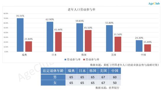 虽然这些国家的法定退休年龄都是65+,但退休人群的再就业比例依然比中国高。韩国、日本、美国、瑞典65—69岁劳动参与率分别为45.5%、41.44%、31.56%、21.84%,中国只有15.49%。