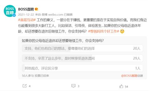 BOSS直聘曾在微博上发起小型互动,你会支持爸妈退休后继续工作吗?58%参与投票的网友不支持,他们认为中老年人是时候享受清福了。