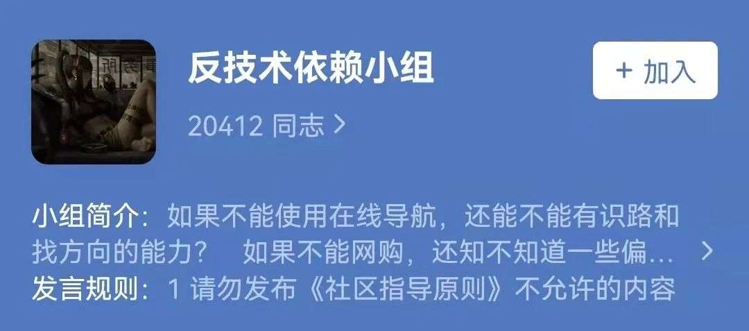 “反技术依赖”小组的不少人在入组宣言中写道:之所以要加入,是因为此前过于依赖技术——手机使用时长每天超过12小时,必须时刻跟人保持联系,一离开手机就无所适从;也有人自认是“线上社牛”,但切换到现实生活中就成了“社交废物”。