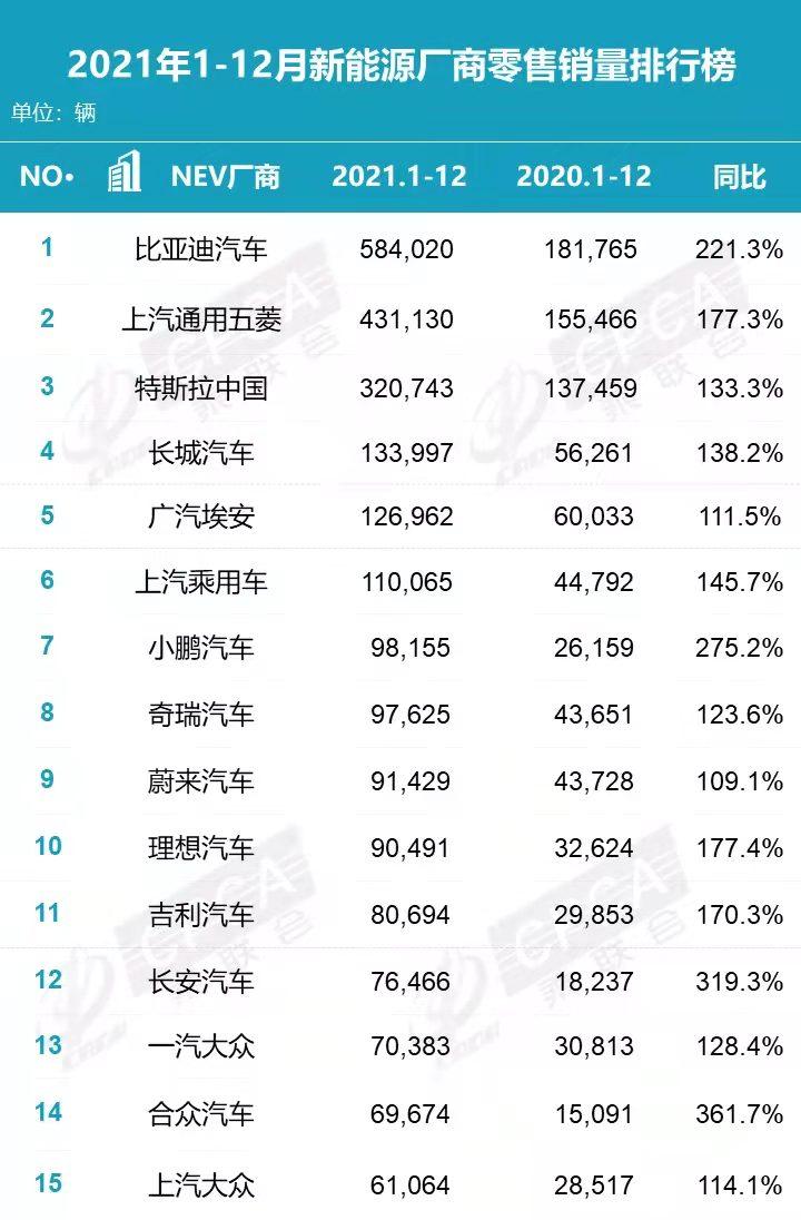 乘联会数据显示,2021年1-12月新能源厂商零售销量排行中,比亚迪汽车、上汽通用五菱、特斯拉中国位列前三,销量分别为58.4020万辆、43.1130万辆和32.0743万辆,同比增长221.3%、177.3%和133.3%。排在4到7位的厂商分别是长城汽车、广汽埃安、上汽乘用车、小鹏汽车、奇瑞汽车、蔚来汽车和理想汽车。