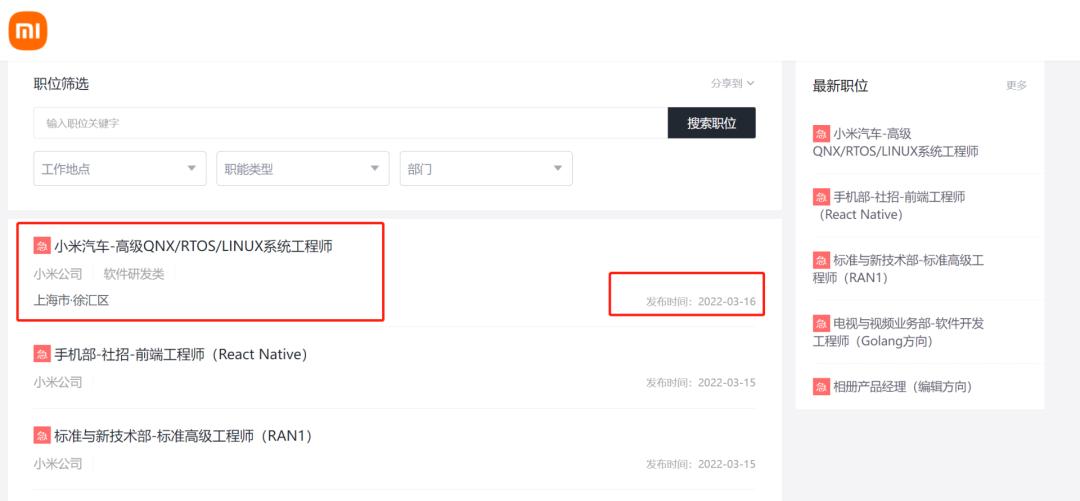 燃财经在近日浏览小米官网的社会招聘时发现,排在第一位的依旧是和汽车相关的职位招聘岗,且注明了“急”。