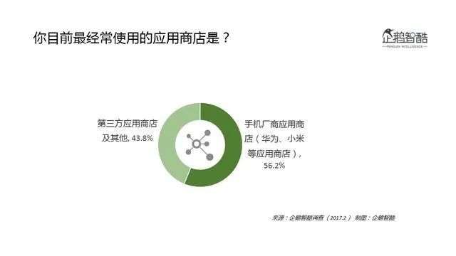 而到了2017年,根据企鹅智库的数据调查显示,在用户最常使用的应用商店中国,手机厂商应用商店(小米、华为等应用商店)已经占比达到56.2%。超过了第三方应用商店。