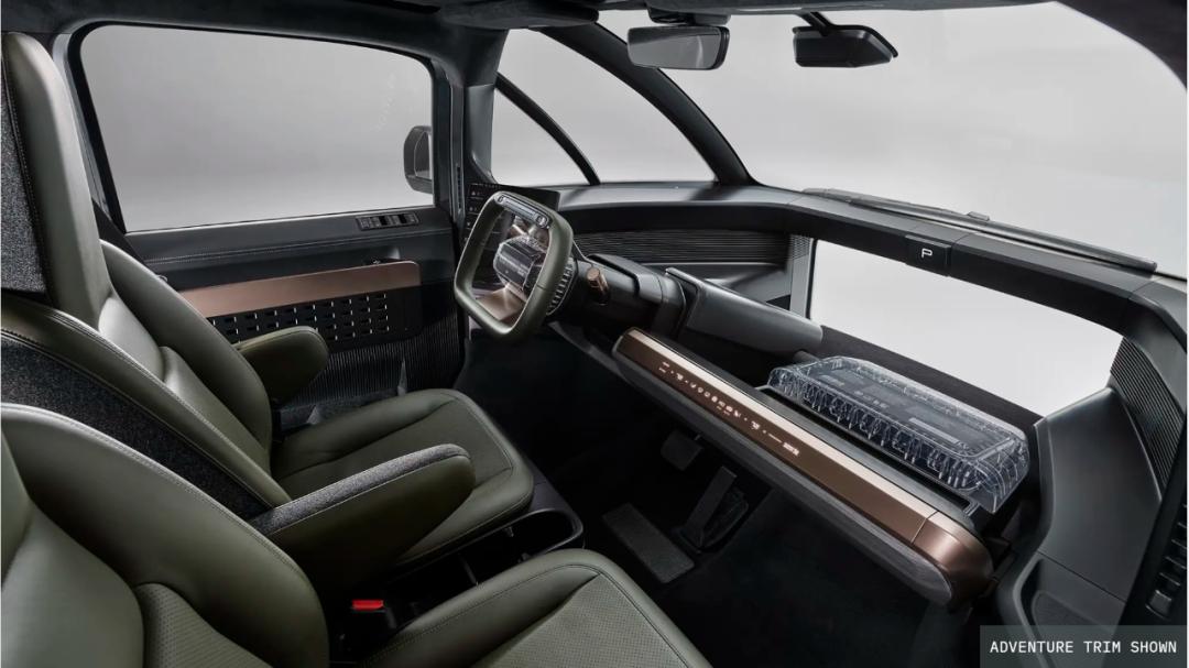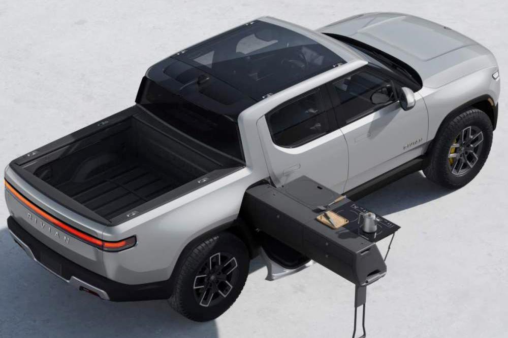 因为车身完全不用迁就底盘,车的内部空间可以实现最大化利用,R1T甚至在货斗前面设计了一个左右连通的“抽屉”,可以用来放滑雪板、钓鱼竿或是当成露营厨房。