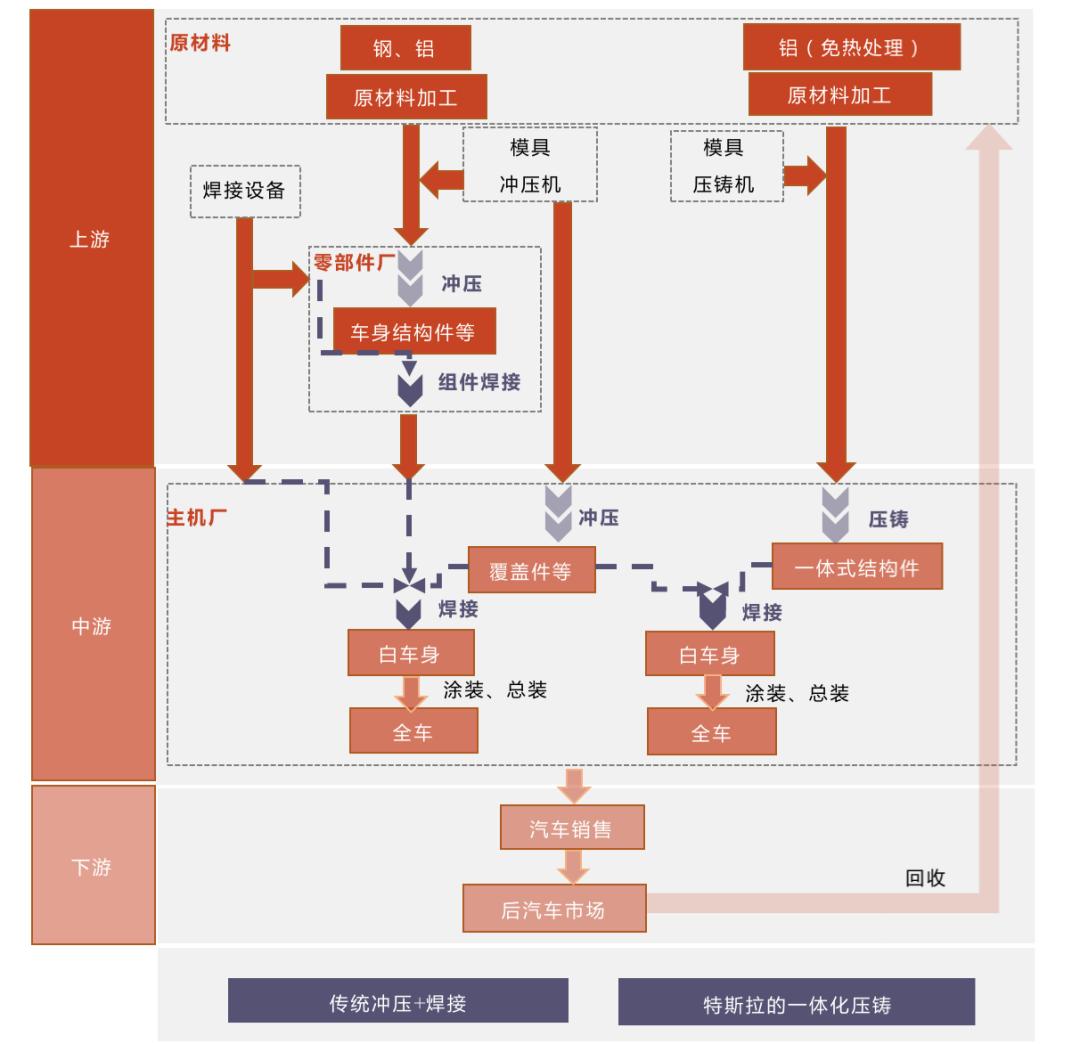 一体化压铸模式与传统“冲压+焊接”模式供应链对比;数据来源:光大证券