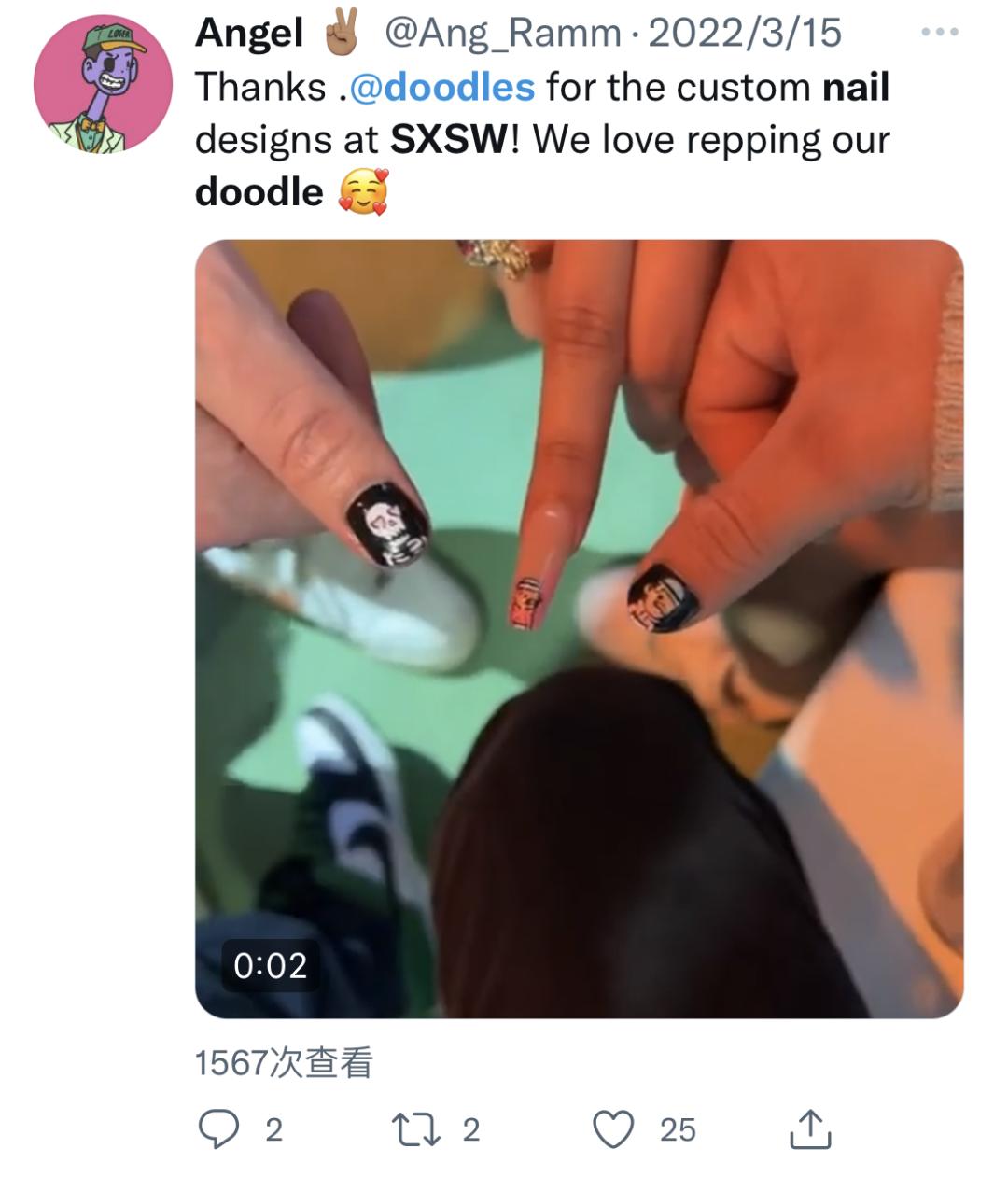 其实离扎克伯格交流的一个街区外,就是 Doodles(一个 NFT 项目)搭起的临时画廊。观众能扫码直接购买 NFT,也能把 NFT 打印在指甲上。