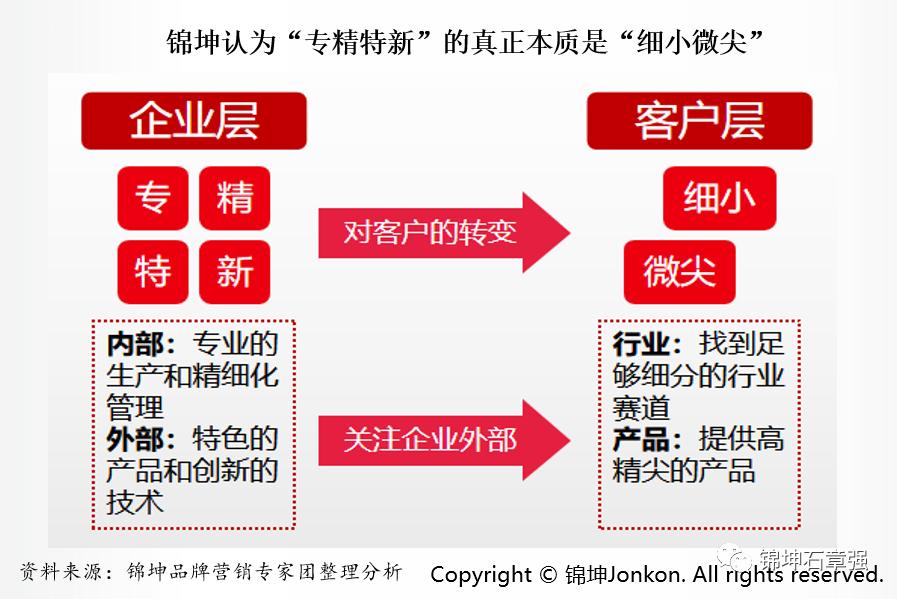 受新冠疫情以及消费升级影响,中小企业普遍面临生存困境,作为国家战略的“专精特新”企业亦面临同样的市场难题。锦坤品牌营销专家认为,“专精特新”企业需要在技术和产品两方面实现用户和需求“细小微尖”的跨越,以“四问”(卖什么、说什么、怎么说和怎么卖)做好品牌顶层设计,以“四复制”(行业复制、区域复制、客户复制和团队复制)做实营销底层运营,才能实现持续化、结构化且跨越周期化的大发展。