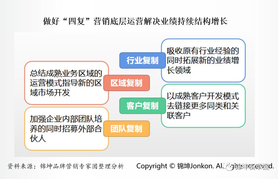 当“专精特新”企业形成了自己在某个细分领域的品牌顶层设计后,还需要采用“四个复制”去作为具体的落地策略,即将单条业务线的盈利模式进行行业、区域、客户和团队的复制,从而实现企业营收复制裂变结构增长。