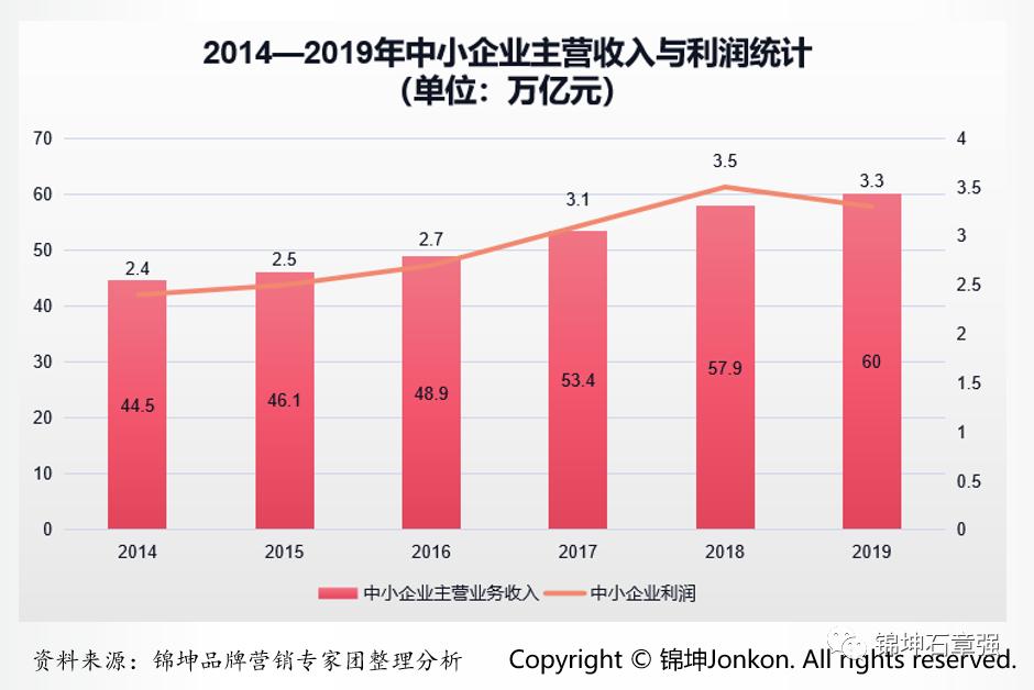 根据国家统计局从2014—2019年的统计数据,总数超过4000万家,占企业总数99%的中小企业营收增速变缓、利润在2019年出现明显的下滑。中小企业群体在当前的营商环境下面临着严峻的营收增长考验,而这个考验细究下来其实就是两个问题,即产品卖不出和产品售价低。