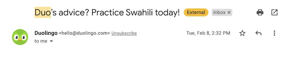 作为一个开场白,一切都很标准。邮件顶部的插图是一只与网站同名的猫头鹰,它正在介绍自己,看起来有点狂躁,但我很欣赏这种活力。我也喜欢插图下方那句漫不经心的提醒——Duolingo是世界上最好的语言学习应用程序——这就是说,想学习斯瓦希里语,我来对地方了。