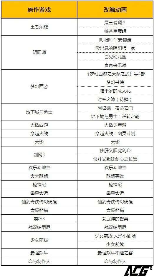 但是这并不代表游戏改编动画就是空白,反而在如今的国内娱乐市场,由游戏官方出品的改编动画作品可以说是相当丰富。ACGx查找并整理了一份国产游戏改编动画的不完全表格。(《拳皇命运》手游是SNK授权给国内游戏公司研发、运营,同名动画是由国内动画公司制作,所以也被纳入该表格中。)