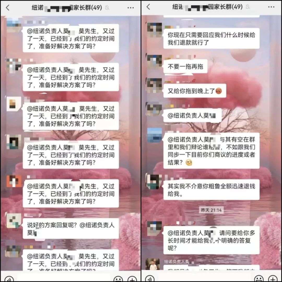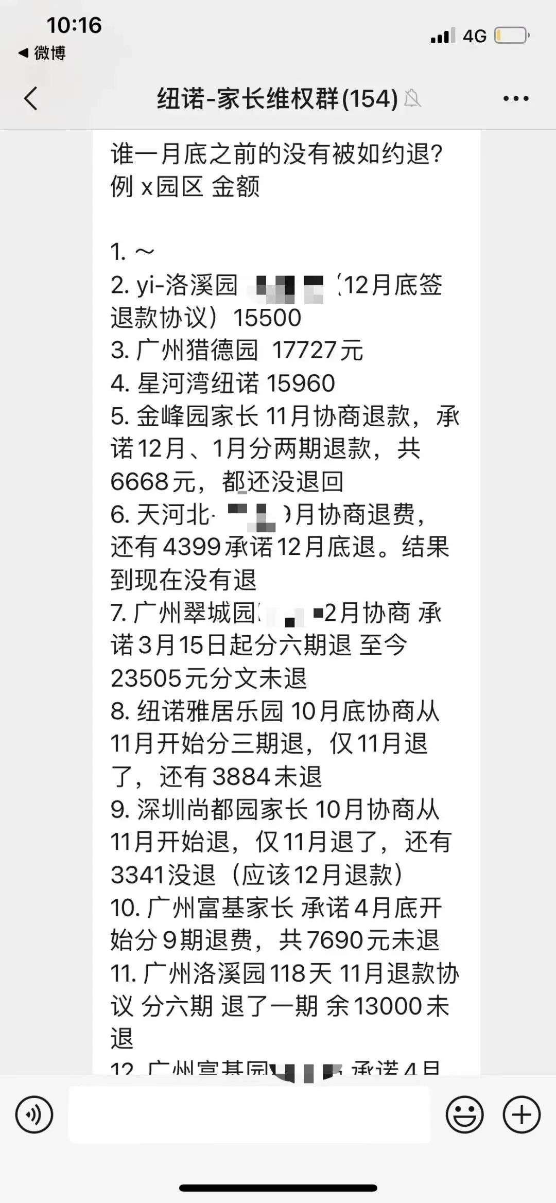 但有家长展示了一个150多人的维权群聊天截图,其中的统计信息显示, 有不少家长是在去年11月份与纽诺协商退费,而且大部分是分期退费,但是纽诺并没有按期退费,有人在收到第一笔分期后再没有收到任何退款。