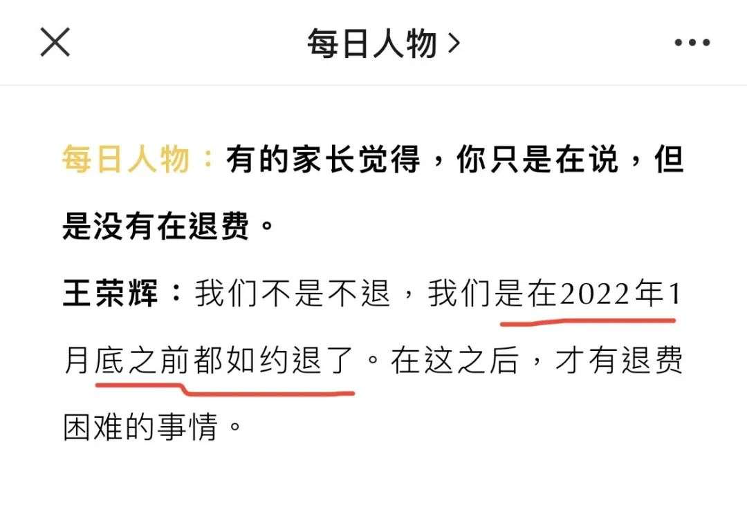 在接受《每日人物》采访时,当被问及退费问题,王荣辉表示在2022年一月底之前的都如约退了。在这之后,才有退费困难的事情。