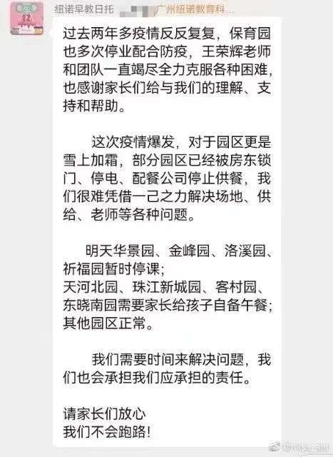 有家长接到通知:3月18号4个园区(洛溪,祈福,华景,金峰)“暂时”停课;4个园区(天河北,珠江新城,客村,东晓南)学生自备午餐,其他园区正常。