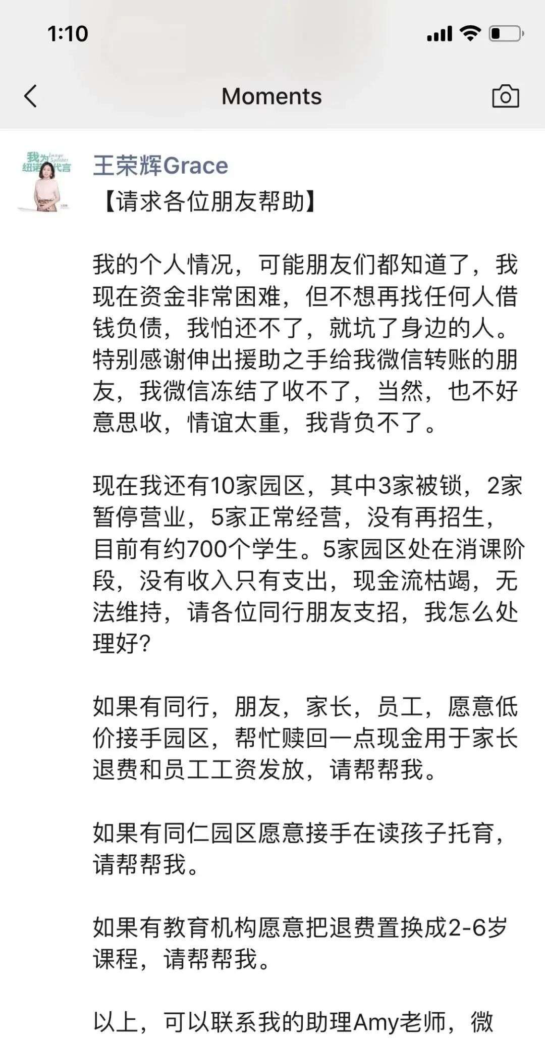 “如果有同行、朋友、家长、员工,愿意低价接手园区,帮忙赎回一点现金用于家长退费和员工工资发放,请帮帮我”,王荣辉这些说。