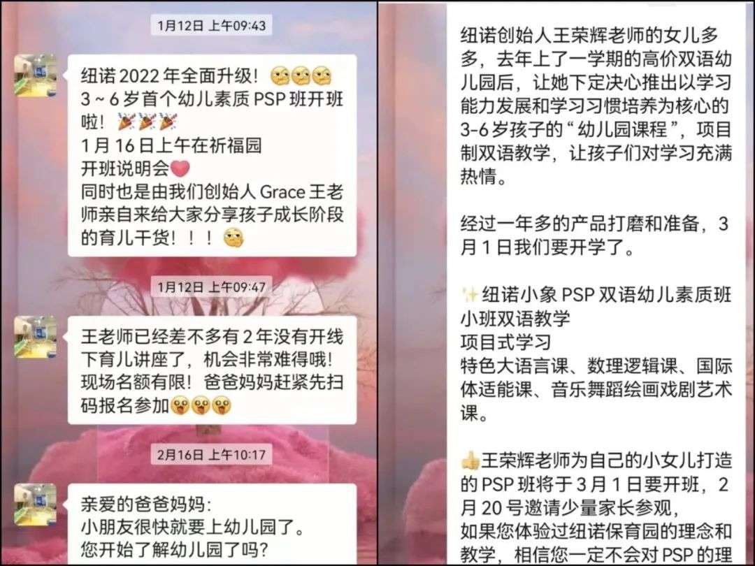 而在王荣辉发文欠债一亿之前,家长们对这一切并不知晓,纽诺还在引导家长购买新课程。