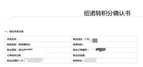 但是出现退费问题后,纽诺开始建议家长将课时兑换成积分。家长介绍,要兑换积分需填写积分兑换申请表。
