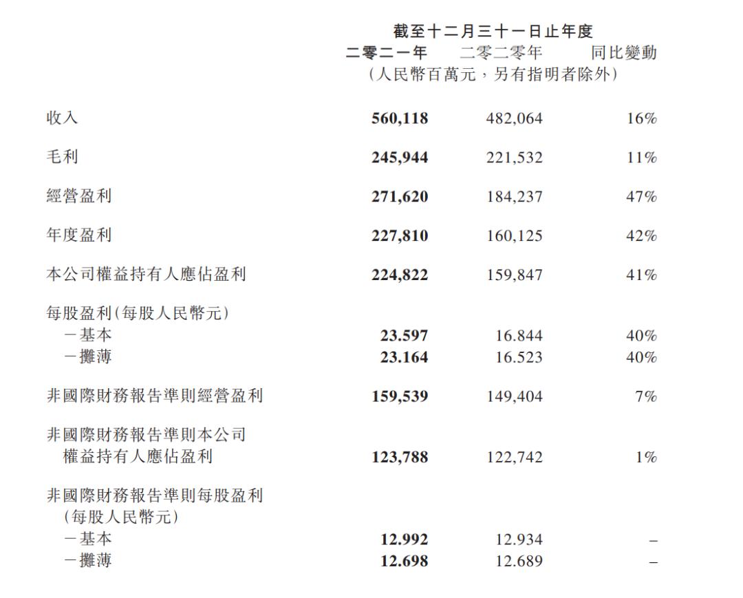 回到全年,腾讯在2021年总收入为5600亿元,同比增长16%,本公司权益持有人应占盈利为2248亿元,同比增长41%。除去包括处置京东集团股份收益782亿元在内的投资等因素,经调整后应占盈利为1238亿元,同比仅微增长1%。