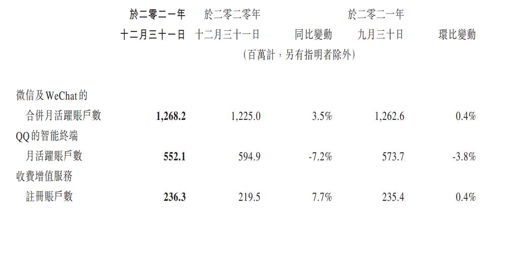 截止2021年12月31日,微信及Wechat的合并月活为12.68亿,同比增长3.5%,环比增长0.4%。