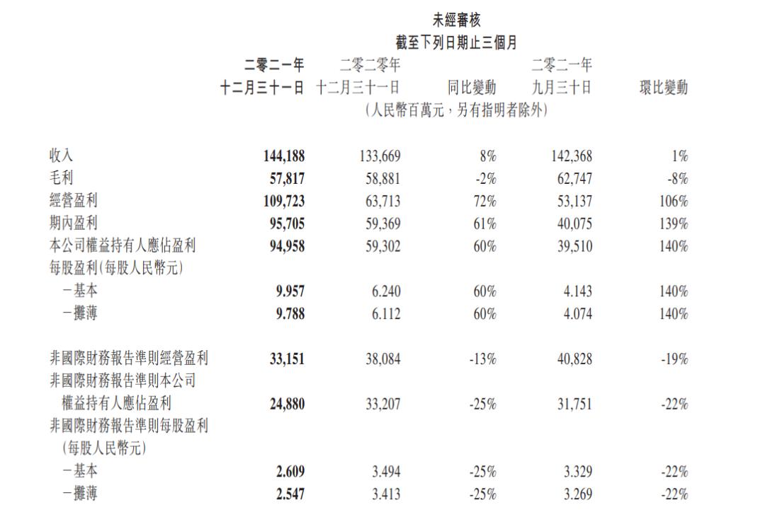 3月23日,腾讯发布2021年Q4及全年财报显示。财报显示,第四季度,腾讯总收入为1442亿元,同比增长8%,本公司权益持有人应占盈利为950亿元,同比增长60%。