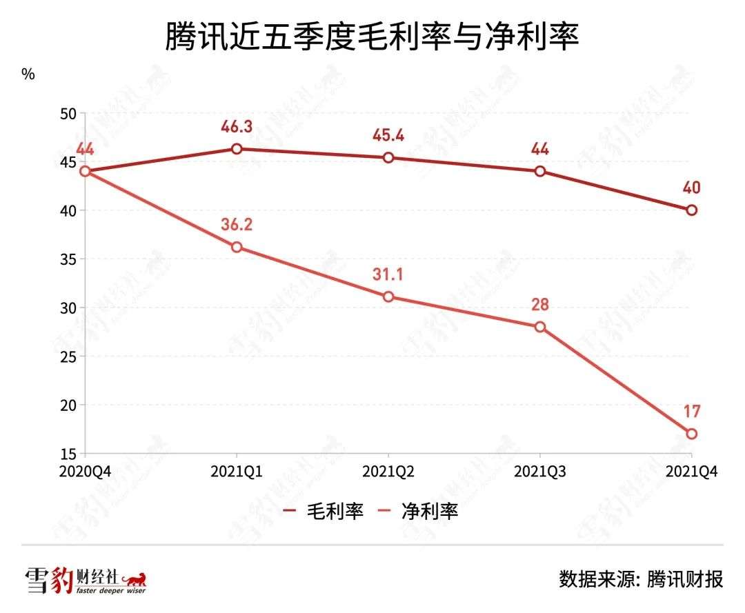 但是,随着低毛利率的FBS业务的营收占比进一步扩大,也逐步拉低了腾讯整体的毛利率和净利率。Q4财报显示,FBS业务收入成本增长13%至349亿元,毛利率仅为27%。同期,腾讯毛利率与净利率分别为40%和17%,与2020年Q4相比(44%/28%),净利率有显著降低。