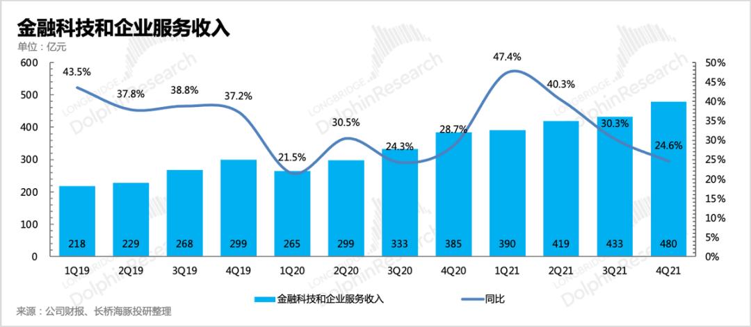 金融科技与企业服务收入,情况要比其他业务好很多。四季度整体实现480亿,同比增长25%。