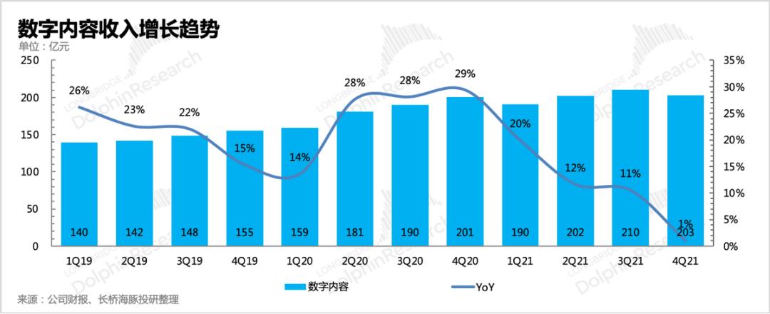 数字内容是泛 娱乐 重要一环,腾讯投入不少,但一直未能对腾讯业绩发挥支撑作用。四季度收入203亿,同比增长1%,结合爱奇艺、腾讯音乐、阅文的财报,数字内容的增长放缓也算是预期之内。