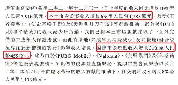 而腾讯3月23日发布的财报披露,2021全年,本土市场游戏收入为1288亿元,增长幅度仅为6%;国际市场游戏收入则快速增加,全年增长31%至人民币455亿元。