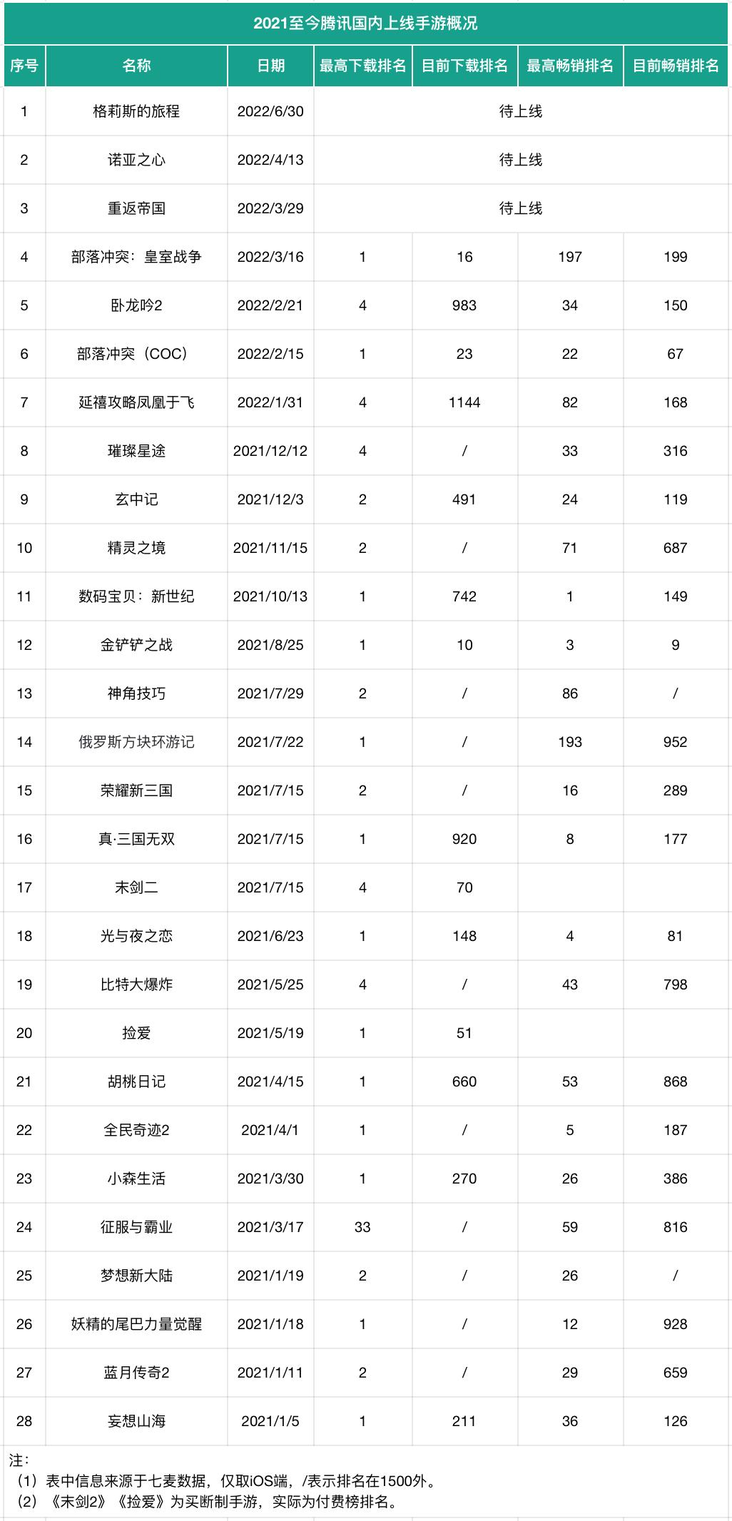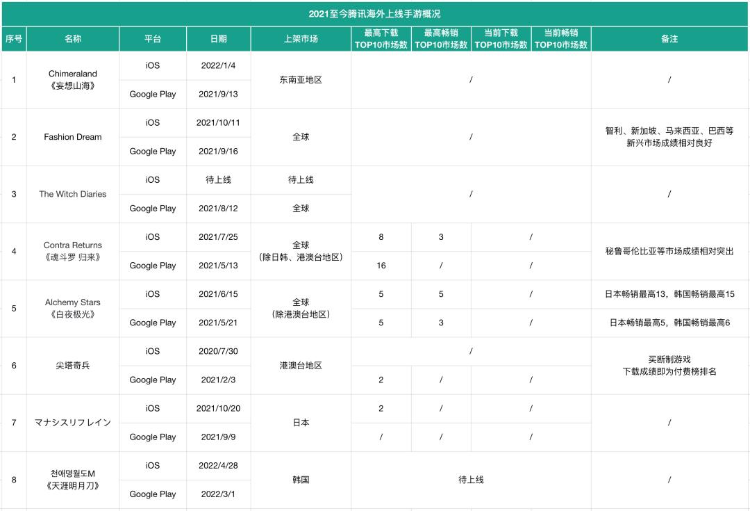 而在过去的2021年中,配合全新的游戏发行品牌Level Infinite,他们通过在海外发行自研产品以加强影响力。据统计,他们共推出了7款手游,相较于上一年,不仅数量有所增加,且成绩与品类都有所突破。
